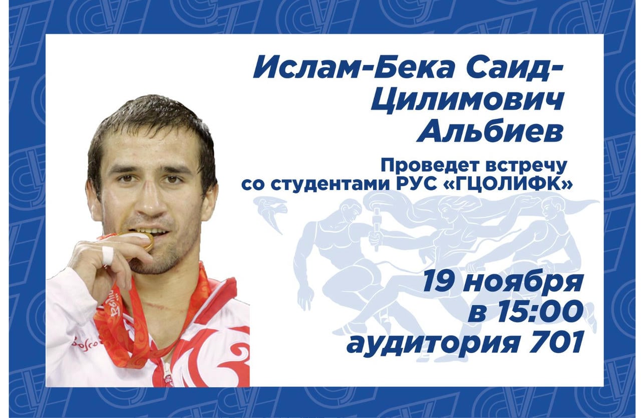 19 ноября в 15:00 в 701 аудитории состоится встреча с выдающимся спортсменом, победителем ХХIХ Олимпийских игр (Пекин-2008) в категории до 60 кг, чемпионом мира (2009), двукратный чемпионом Европы (2009, 2016), заслуженным мастером спорта России — Альбиевым Ислам-Бека Саид-Цилимовичем!