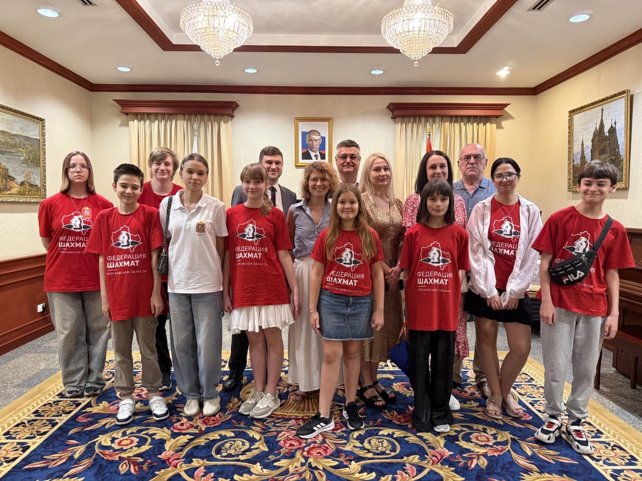 Делегацию возглавил исполнительный директор Федерации шахмат Московской области, руководитель проекта «Шахматная дипломатия» Альберт Миннуллин. На встрече присутствовали наши юные шахматисты и их родители, а также почетный президент ФШМО и знаменитый арбитр Михаил Витальевич Крюков.