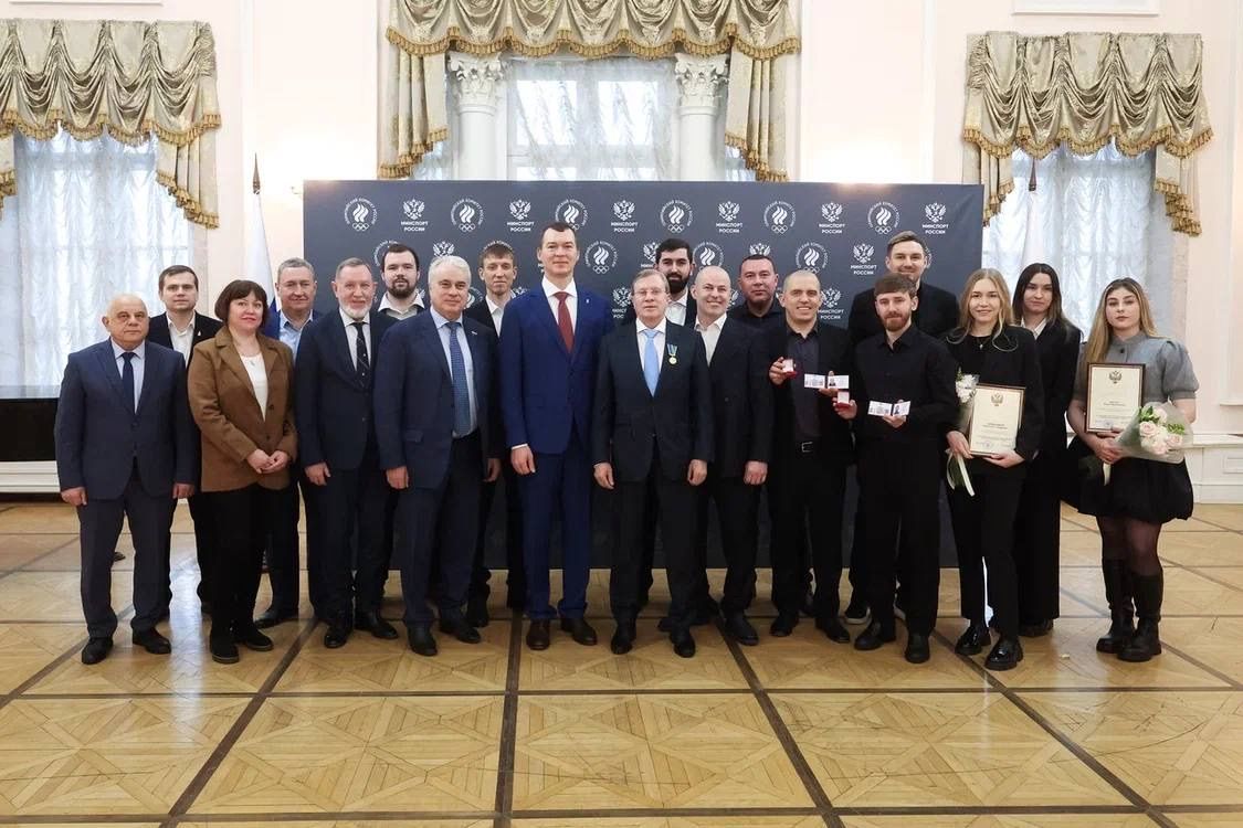 Министр спорта России, председатель Олимпийского комитета России Михаил Дегтярев вместе с Заместителем Председателя Правительства России Виталием Савельевым вручил ведомственные награды, знаки и удостоверения к почетным званиям представителям бильярдного спорта.