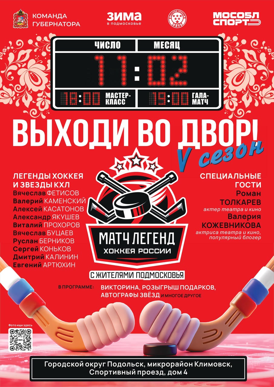 19:00 – торжественное открытие, матч «Легенды хоккея» vs «Сборная Подольска».