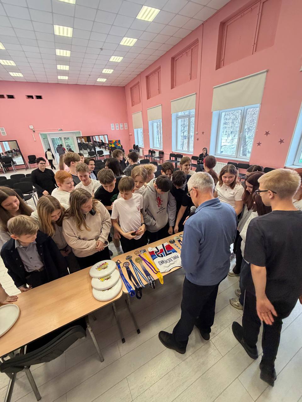 Затем участники мероприятия прошли в спортзал, где бросали, ловили диск, работали в парах. В конце урока поиграли, попробовали силы в зонах нападения и защиты, показали точность броска и почувствовали поддержку игроков своей команды.