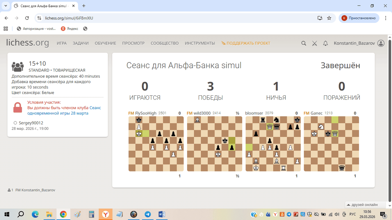 В числе участников были три мастера ФИДЕ, так что сеанс продлился целых полтора часа.